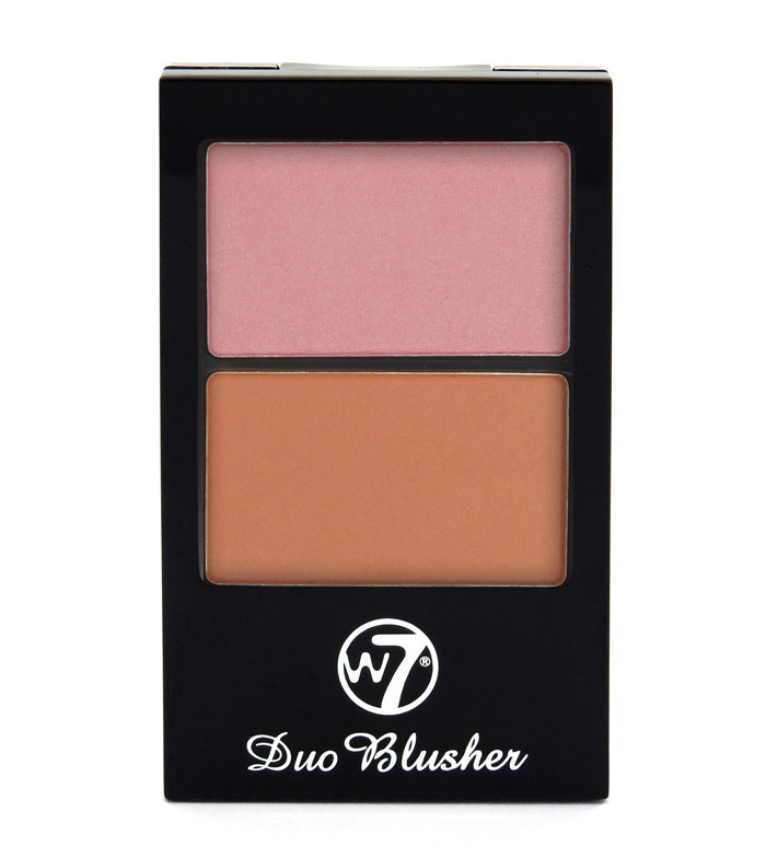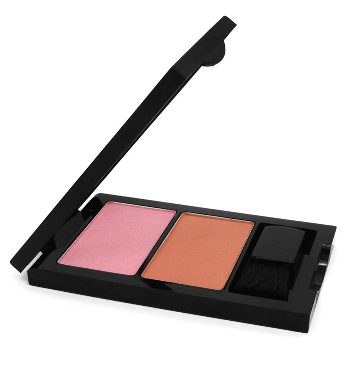 Duo de blushes compactos. Esta paleta inclui dois tons intensos, um marrom e outro rosa. Inclui também um pequeno pincel para aplicar o rouge.