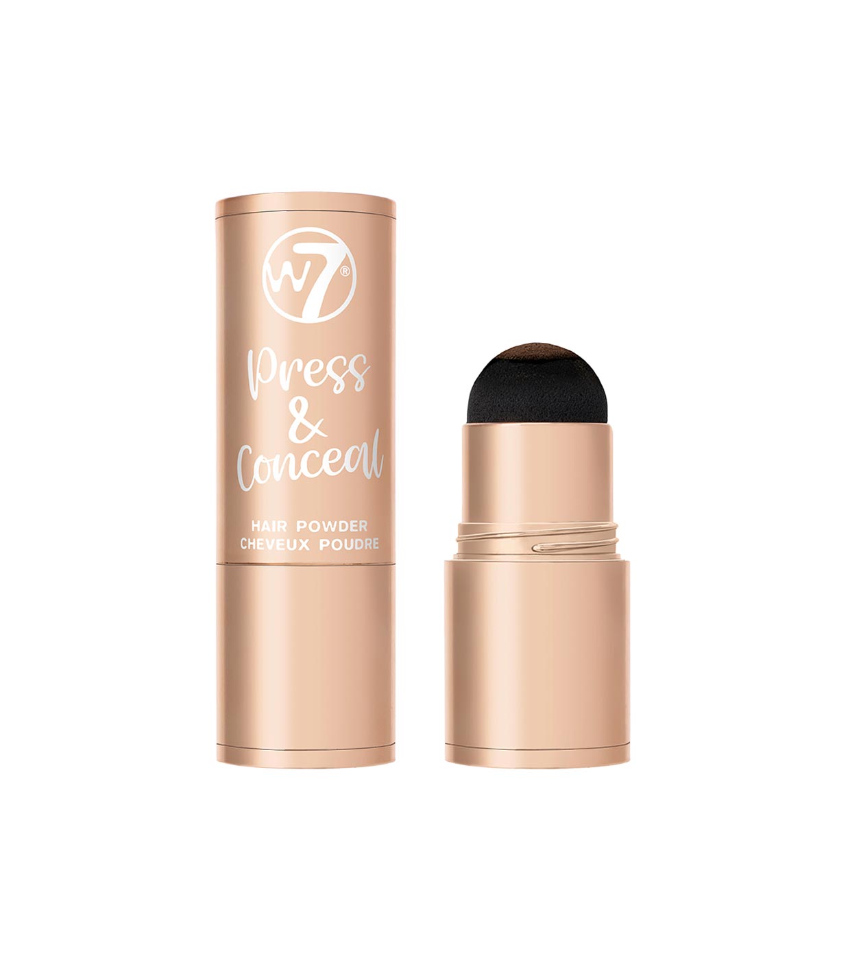 Press and Conceal W7 O pó para cabelo é um pó superleve que pode ser pressionado na linha do cabelo ou couro cabeludo para cobrir as raízes e fixar rapidamente a linha do cabelo.