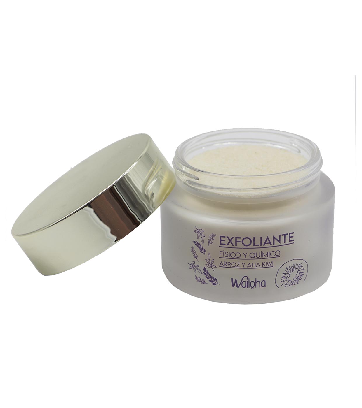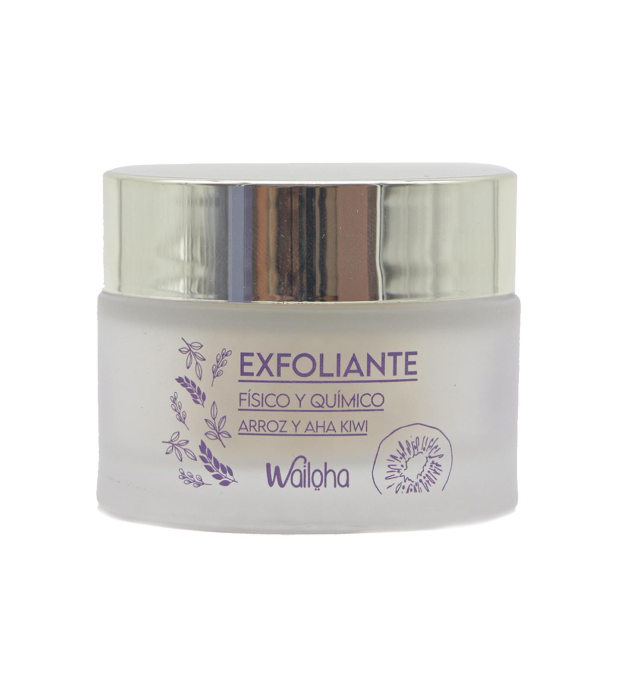 Esfoliação facial física e química com arroz e kiwi AHA da coleção Calma de Wailoha.