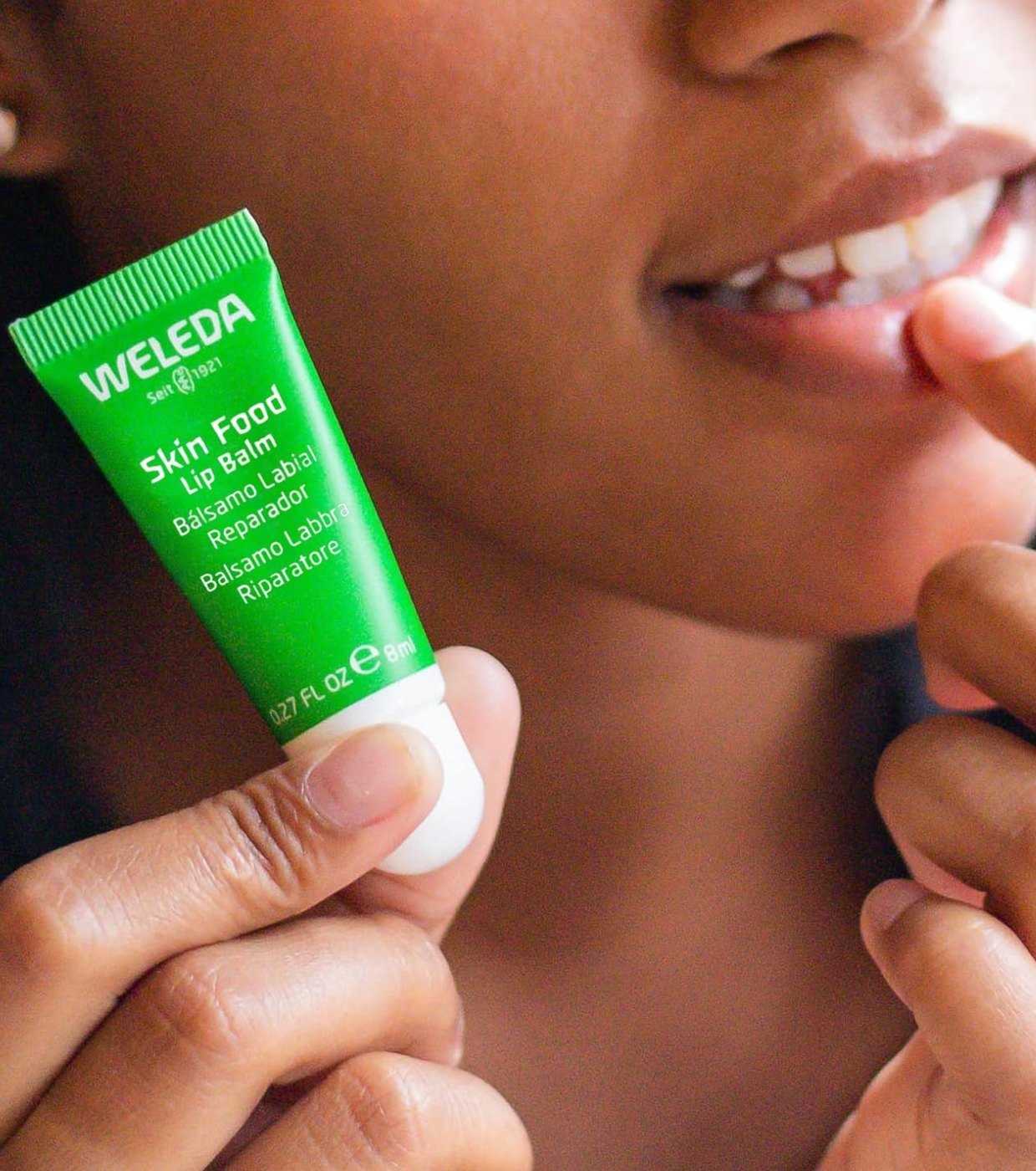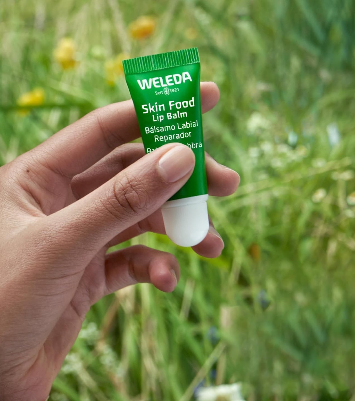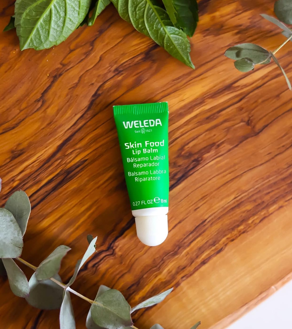 O bálsamo labial Skin Food da Weleda é 100% natural e foi desenvolvido para hidratar, suavizar e proteger os lábios, especialmente em condições climáticas frias.