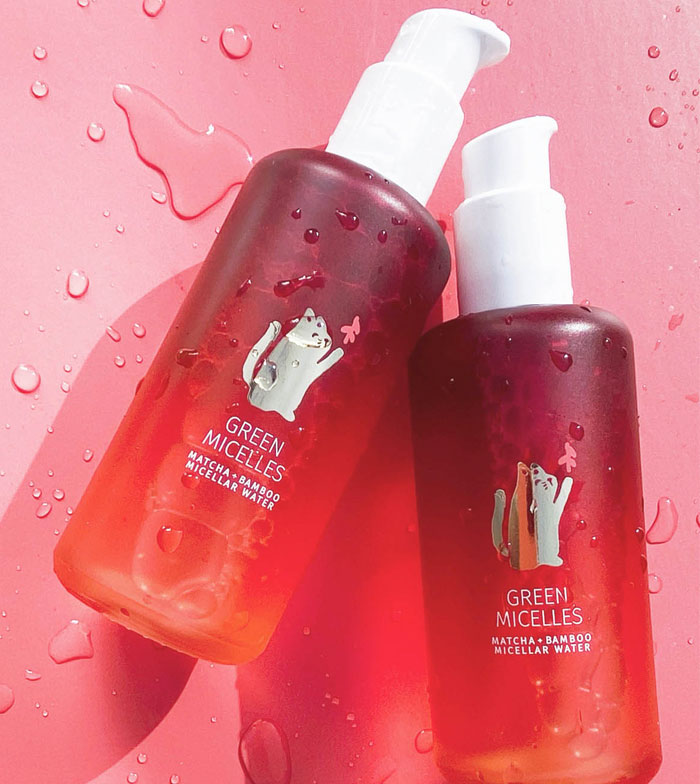 Micelas verdes (partículas esféricas que absorvem as impurezas) limpam suavemente a pele e removem a maquiagem.