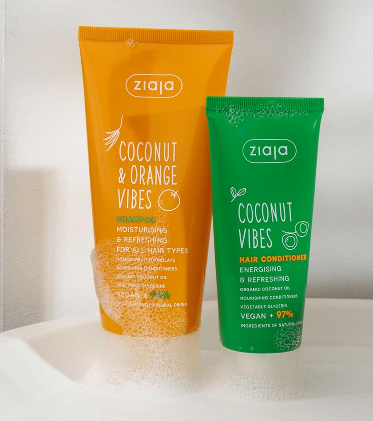 Condicionador energizante e refrescante com notas de coco, Coconut and Orange Vibes de Ziaja.