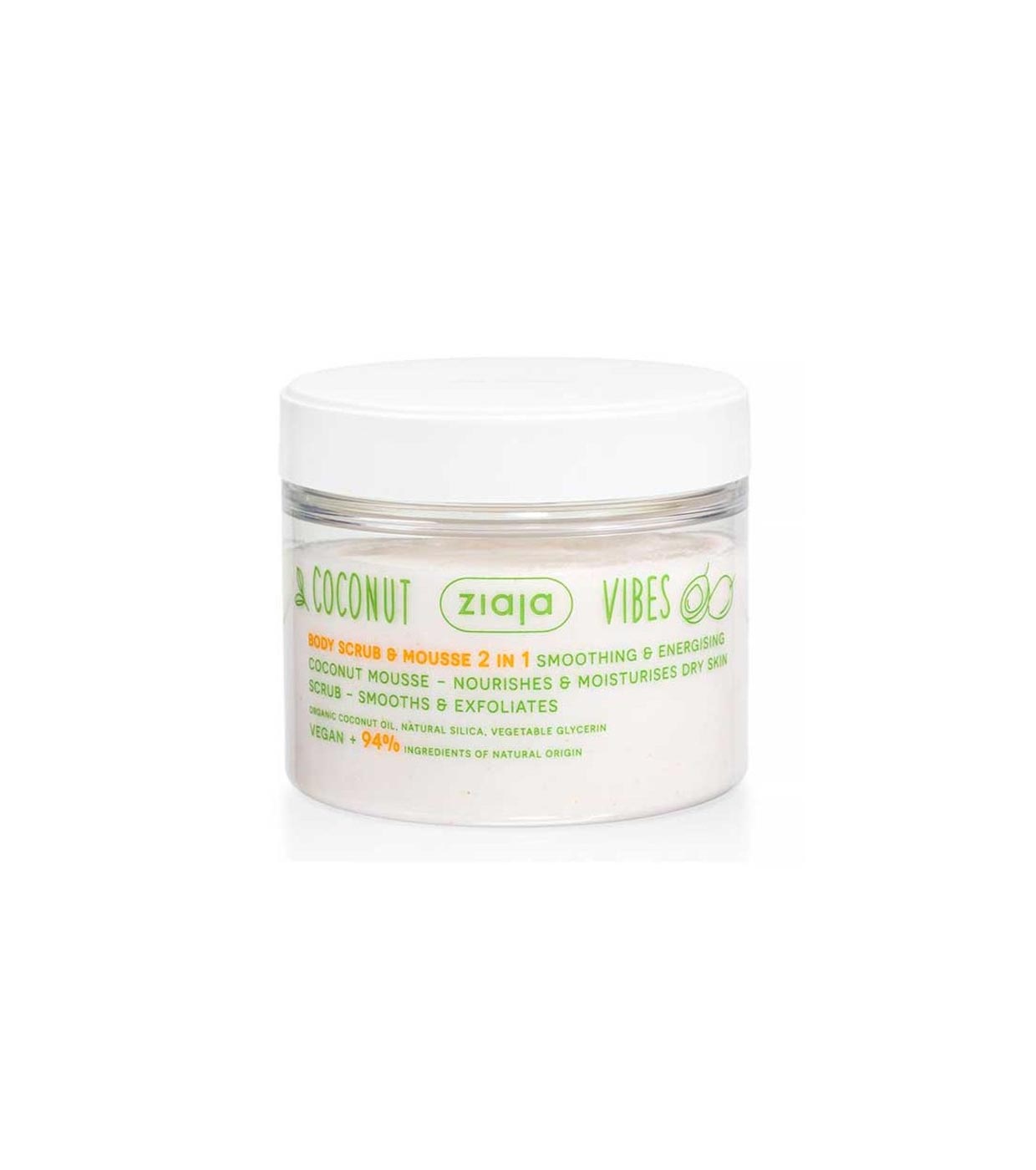 Esfoliação corporal e mousse 2 em 1 com notas de coco, Coconut and Orange Vibes de Ziaja.