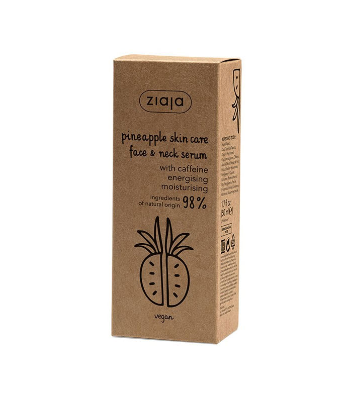 O sérum cafeinado para rosto e pescoço da linha Abacaxi Ziaja tem uma fórmula leve e concentrada com uma textura em gel que efetivamente revitaliza a pele.